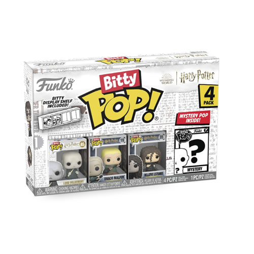 - This 4-pack includes Bitty Pop! Lord Voldemort, Draco Malfoy (Quidditch), Bellatrix Lestrange, and a mystery Bitty Pop! figure. The possible mystery Bitty Pops! are Hyper Rare (1/6) Harry Potter (Quidditch), Hyper Rare (1/6) Hedwig, Rare (1/3) Fawkes, and Rare (1/3) Severus Snape.