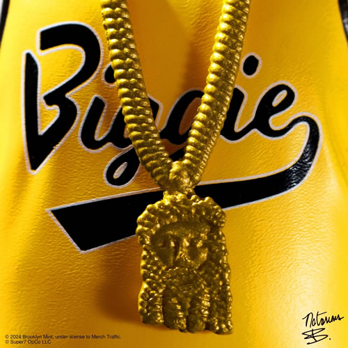 - Inspired by the music video for his debut hit single, Juicy, this figure features Biggie in his iconic yellow jersey and includes microphone and removable chain accessories.