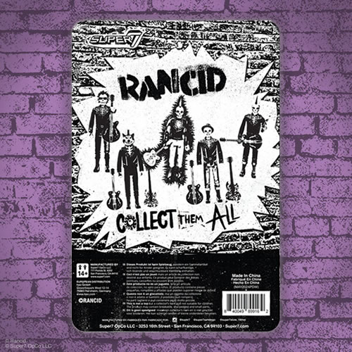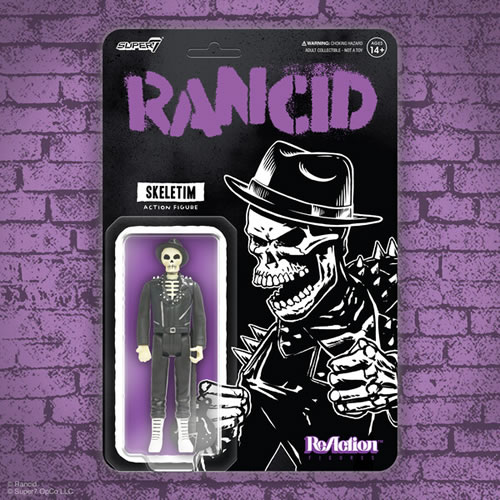 • The latest articulated, 3.75” scale Rancid ReAction Figure of Time Bomb Skeletim is inspired by the hit track from the band’s third studio album and features Skeletim in a black coat, white shoes, and black hat, includes a guitar accessory, and comes packaged on a blistered cardback.