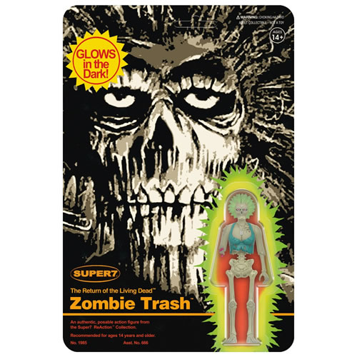 - This 3.75” scale, articulated Return of the Living Dead ReAction Figure of Zombie Trash is inspired by the movie poster for the 1985 cult classic film and features the former attention-seeker-turned-brain-eater in a toxic, glow-in-the-dark colorway, packed on blistered cardback packaging.