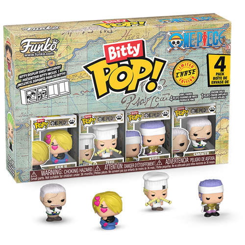 • Expand your One Piece collection with this 4-pack featuring Bitty POP! Sanji, Bitty POP! Zeff, Bitty POP! Krieg, and a chase Bitty POP! figure. The possible chase Bitty POP! collectibles are Hyper Rare (1/6) Shanks, Hyper Rare (1/6) Buggy the Clown, Rare (1/3) Smoker, and Rare (1/3) Dracule Mihawk.