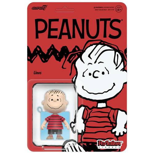 • Make room in your Peanuts collection for this retro-style ReAction Figure of Linus, who comes with a fabric fleece blue blanket. The fabric ring at the corner slips over his hand, so you can pose him with his “security blanket.”