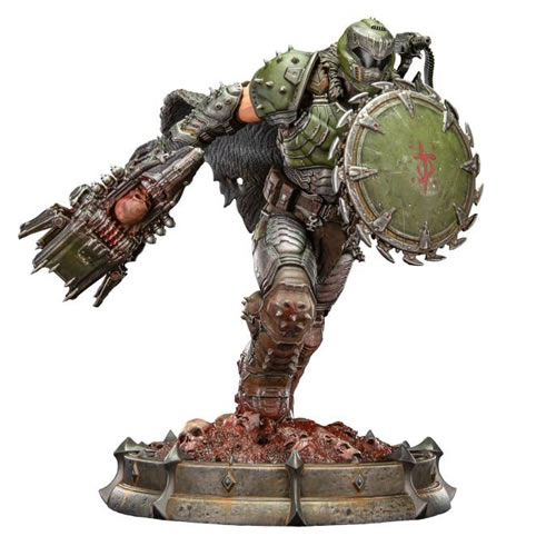 • Featured in this ultra detailed PVC statue is the Doom Slayer wielding his mighty Pulverizer and Shield Saw as he barrels through a carnage filled wasteland to vanquish demons and foes that get in his way.