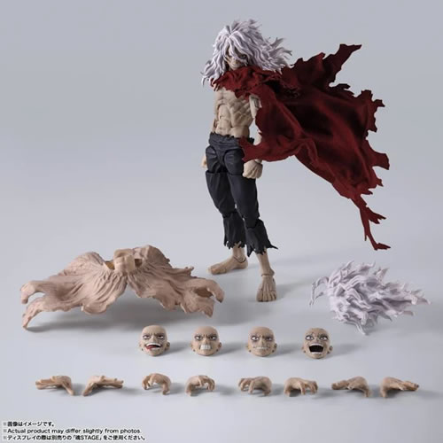 • From My Hero Academia, Tomura Shigaraki joins the S.H.Figuarts line with four interchangeable facial expressions, four pairs of hands, alternate waist and hair parts, and a cloth cape.